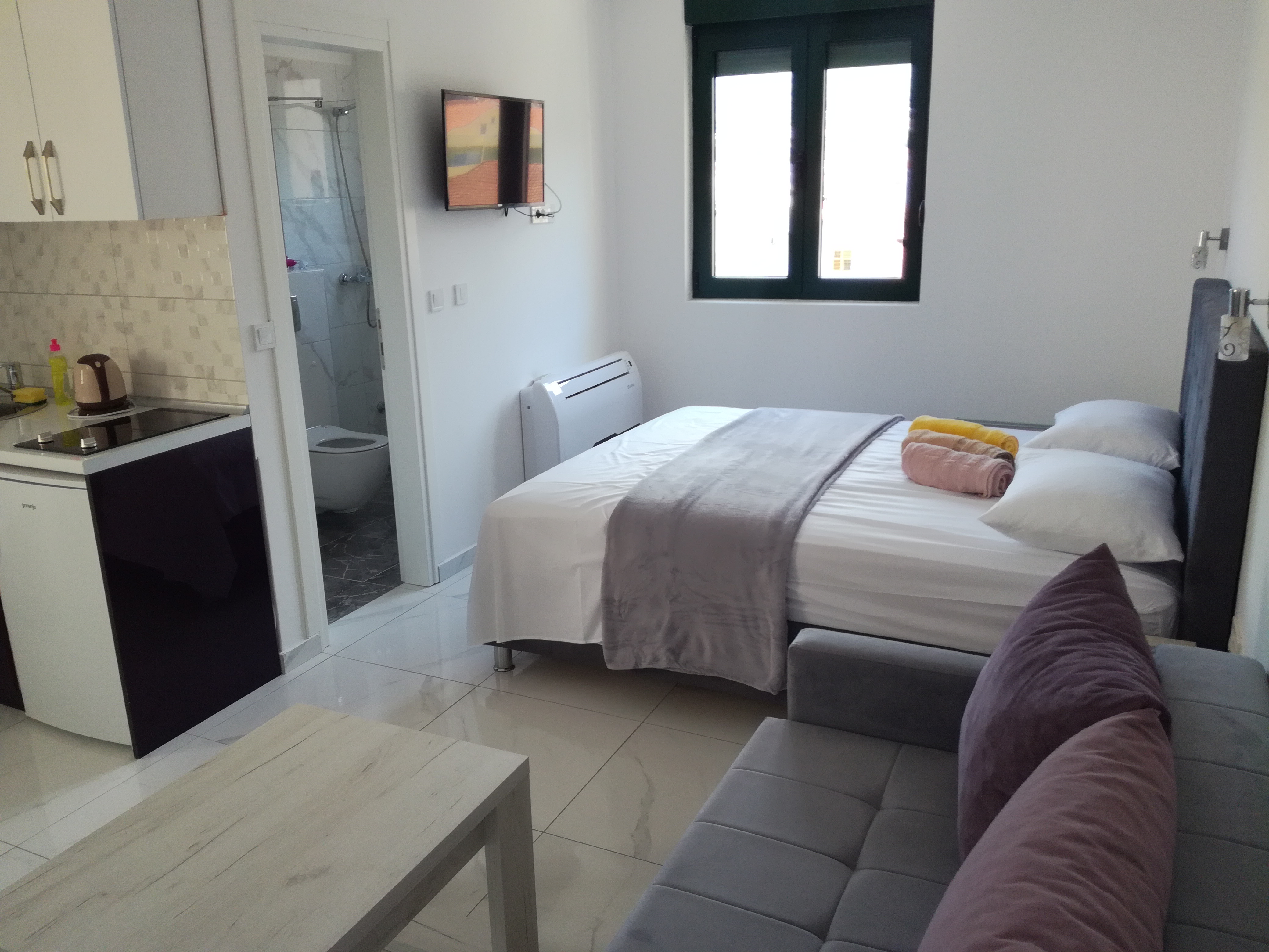 Studio se nalazi na drugom spratu i površina mu je 25m2. Kapacitet 3 osobe. Terasni sto i dvije stolice se nalaze pored vrata studia na zajedničkom stepeništu.